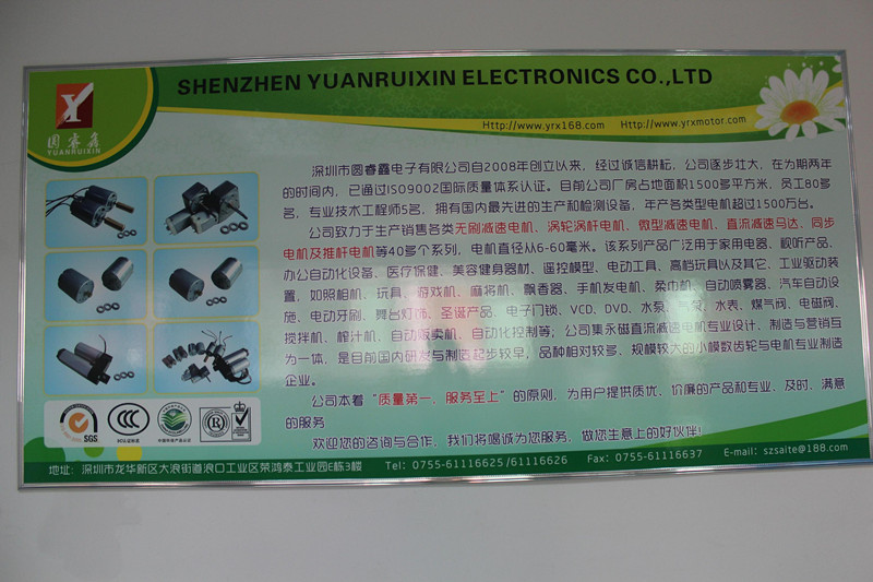 深圳市圓睿鑫電子有限公司自2008年創(chuàng)立以來,經過誠信耕耘,在為期兩年的時間內,已通過ISO9001:2000國際質量體系認證。公司廠房占地面積2000多平方米,員工100人,專業(yè)技術工程師6名,擁有國內最先進的生產和檢測設備,年產各類減速電機超過2~300萬臺。因公司發(fā)展需要,于2020年底,將生產基地遷往擁有最美小鎮(zhèn)之稱的東莞市清溪鎮(zhèn),依山傍水,依托美麗的大自然環(huán)境和地方文化,全新的東莞市圓睿鑫電子有限公司將借助深圳母公司平臺,一步步走上新的臺階。